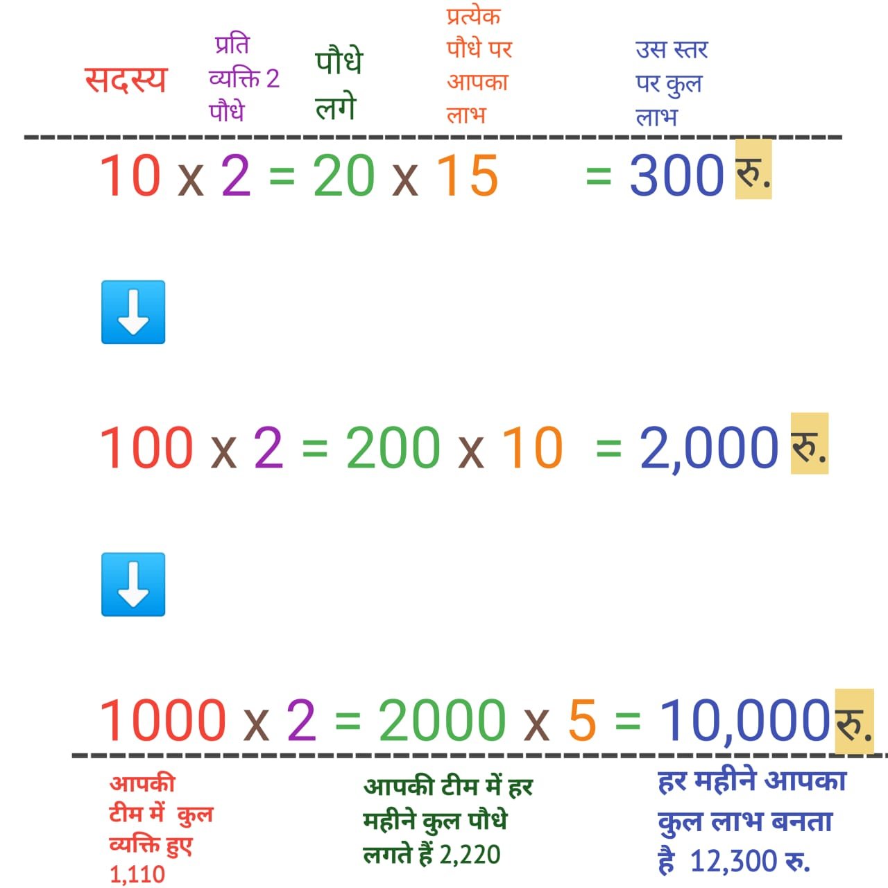 जैसे आपने 10 सदस्य से 2 - 2 पौधे लगवाए तो पौधे लगे 20 , अब यहाँ आपको प्रत्येक पौधे पर 15 रुपए लाभ मिलता है तो 20 पौधे पर आपका इनाम 300 रुपए बनता है अब ये 10 लोग इसी तरह अपने 10 -10 लोगो से 2-2 पौधे लगवाते है तो आगे सदस्य हुए 100 और पौधे लगे 200 , अब यहाँ आपको 10 रुपए प्रति पौधा प्राप्त होता है यहाँ से आपका लाभ बना 2000 रुपये . अब तीसरे स्तर पर ये 100 लोग अगले 10-10 लोगो को इस नेक कार्य में शामिल करते है तो लोग हो जाते है 1000 और पौधे लगते है 2000, अब यहाँ से आपको 5 रुपए प्रति पौधा प्राप्त होता है तो आपका लाभ 10 ,000 रुपए यहाँ से बनता है |अर्थात आप न ही तीसरे स्तर के 1000 लोगो को जानते है और न ही दूसरे स्तर के 100 लोगो को जानते है बल्कि आपने सिर्फ 10 लोगो को संगठन में पौधे लगाने के लिए शामिल किया था लेकिन तीनो स्तर तक आपको लाभ प्राप्त होता रहता है |अर्थात आपकी पूरी टीम हर महीने 2-2 पौधे लगाती है और आपको हर महीने 12,300 रुपए प्राप्त होते रहते है |